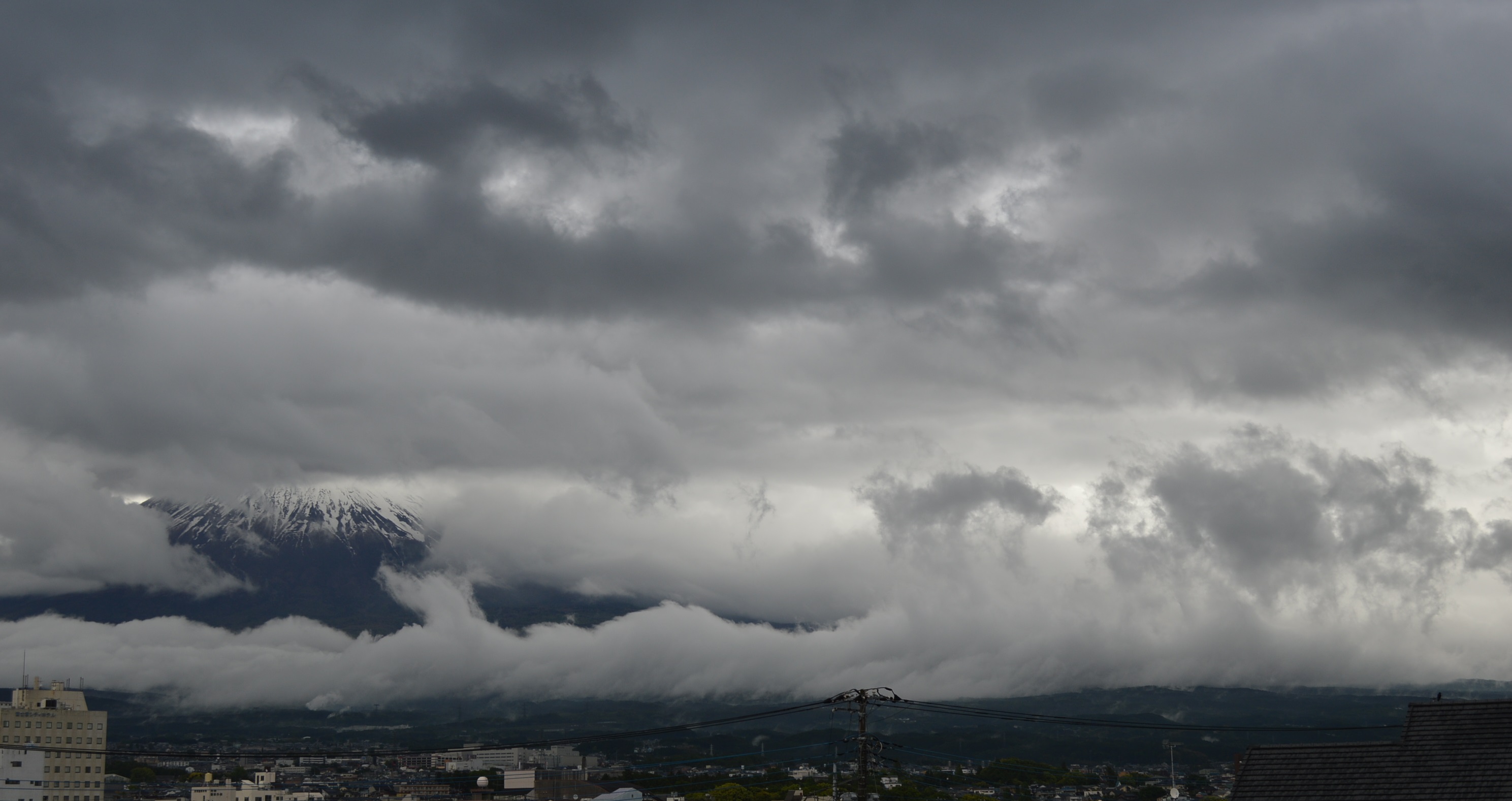 今朝は昨夜から降り続いた雨が止み、富士山のまわりは雲が早く流れて幻想的な雰囲気です。